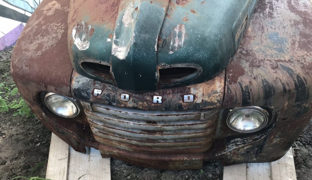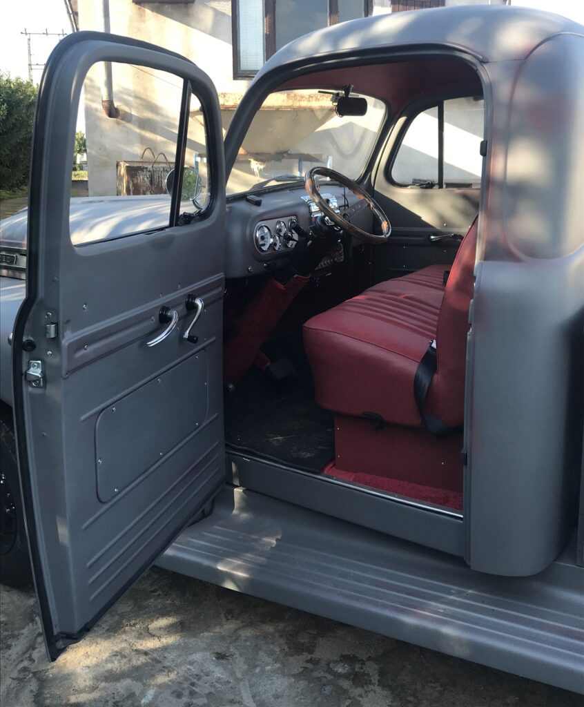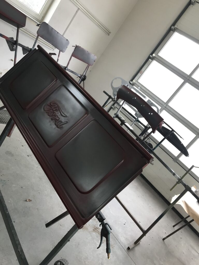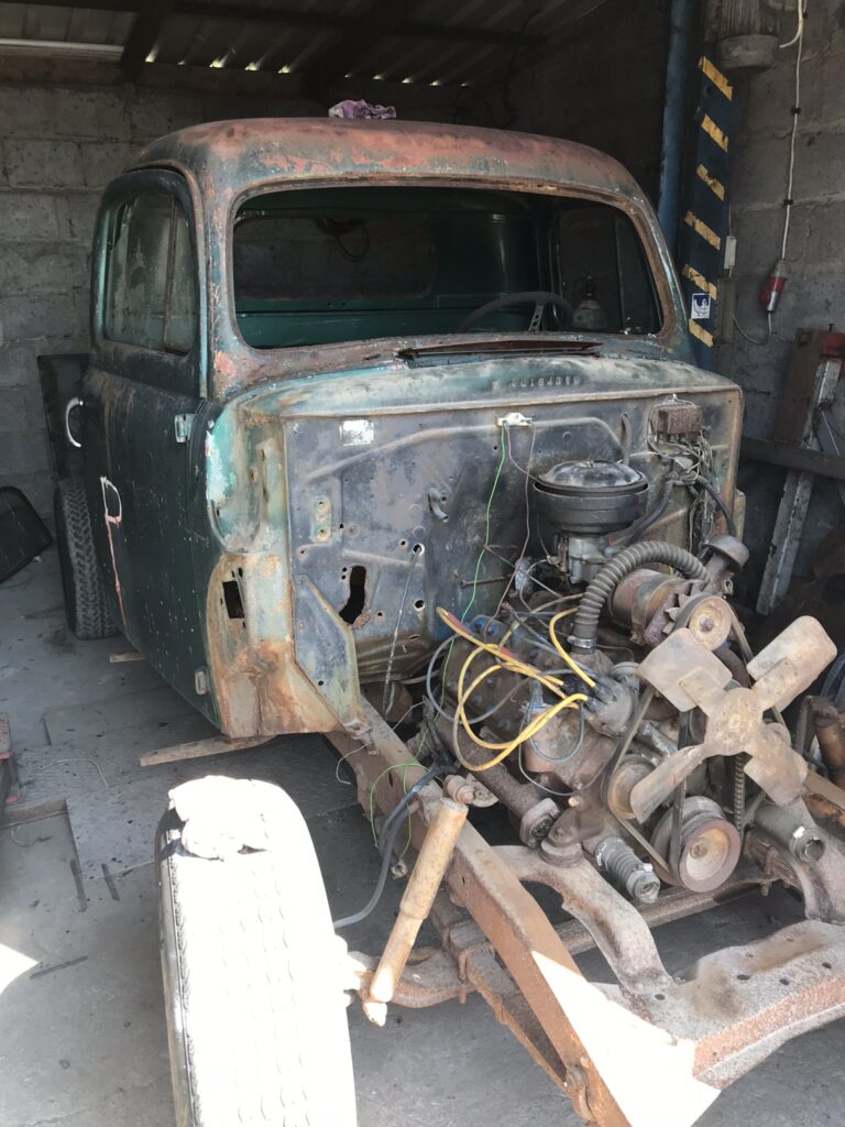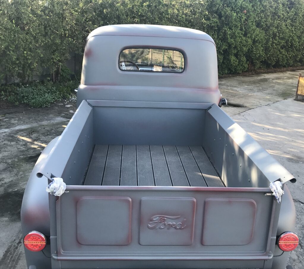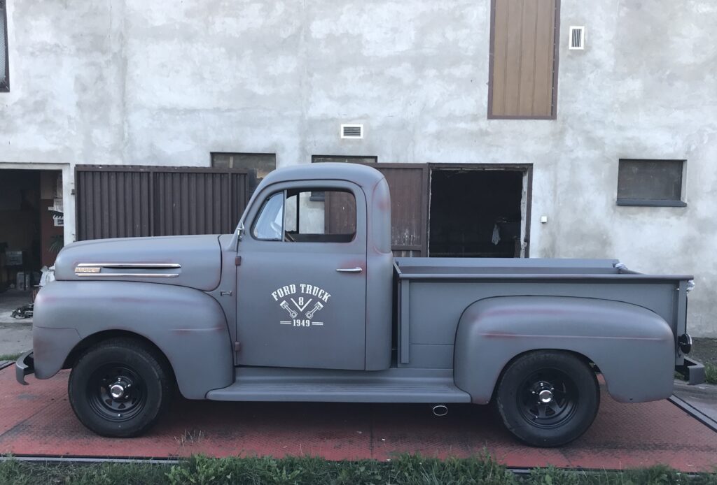 Wszystkie części przeznaczone do ponownego użytku zostały starannie wypiaskowane i zabezpieczone antykorozyjnie. W międzyczasie pojawił się pomysł, żeby zmienić silnik, ponieważ częstą wadą 239 Flathead był problem z przegrzewaniem się, który powodował pękanie bloku silnika – akurat trafiliśmy na wadliwy egzemplarz, nie chcąc ryzykować podobnej awarii zdecydowaliśmy się na swap silnika na nowszy. Zmodyfikowaliśmy również hamulce, ponieważ w oryginale z przodu były bębnowe, co mogłoby dawać niewystarczającą siłę hamowania przy nowszym, mocniejszym silniku. Zmiany te wymagały ogromnego nakładu prac, trzeba było od zera ręcznie dopasować inne hamulce oraz zaprojektować zupełnie nowe mocowanie silnika. Następnie cała instalacja elektryczna musiała zostać przeniesiona z samochodu ,,dawcy” i przystosowana do Forda F-1. Stwierdziliśmy również, że chcemy pick-upa pomalować w tzw. patynę.